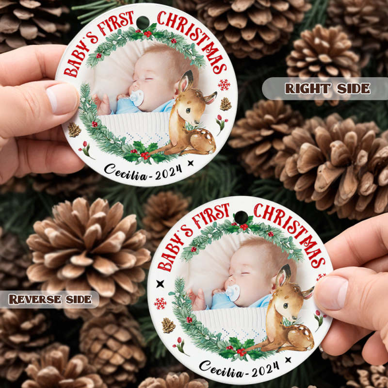 Cette décoration en céramique personnalisée est le cadeau parfait pour le premier Noël d'un nouveau-né. Ajoutez une photo du bébé pour la rendre vraiment unique et spéciale. Célébrez cette étape importante avec un souvenir personnalisé qui sera chéri pendant des années.